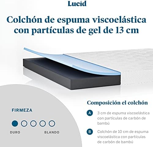 LUCID Colchón de espuma viscoelástica de 13 centímetros de grosor con partículas de gel -Base de carbón de bambú sostible – Funda transpirable