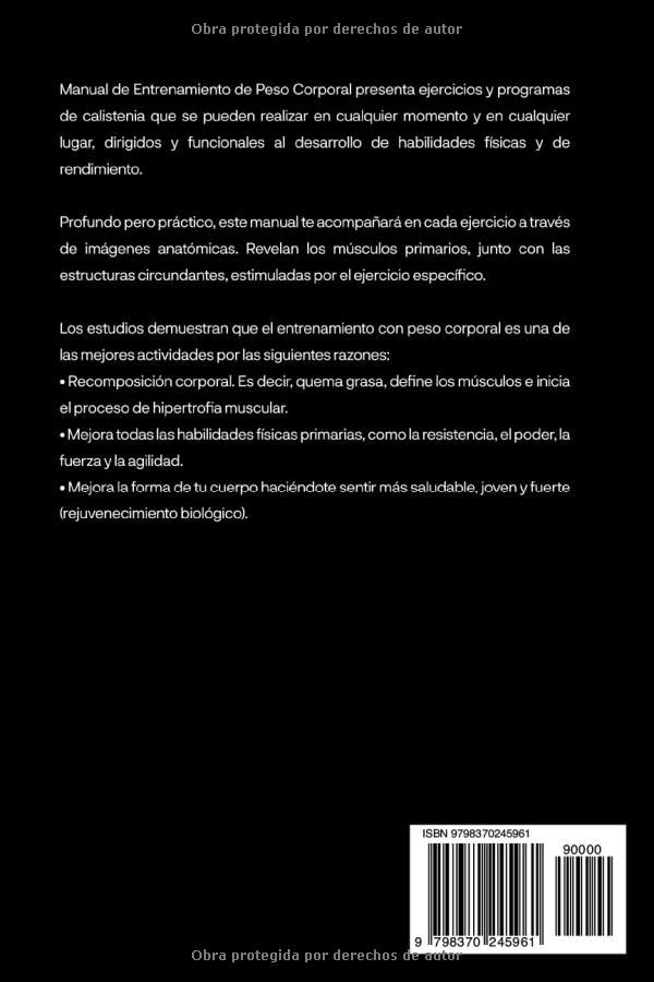Manual de Entrenamiento de Peso Corporal presenta ejercicios y programas de calistenia que se pueden realizar en cualquier momento y en cualquier lugar, dirigidos y funcionales al desarrollo de habilidades físicas y de rendimiento.