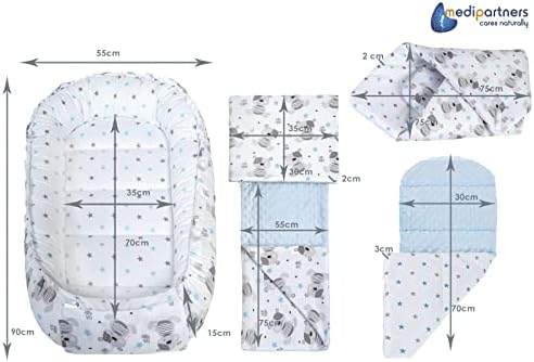 Medi Partners Juego de 5 Piezas Nido Bebé Recién 100x60x15cm Plantilla removible Cunas Nido para bebés Reductor de Cuna 100% Algodón (Oso de Peluche con un Minky Celeste)