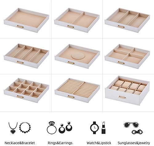 Multifunciones: con 9 cajones multifunciones, el enorme joyero puede almacenar muchas joyas ,como anillos, aretes, collares y pulseras etc. Las almahadas suevas en el cajón debajo son adecuadas para guardar relojes. Un cajón mas profundo es muy adecuado con almacenar gafas de sol y unas joyas grantes.