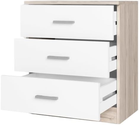 Mueble fabricado en melamina, con acabado en color Sahara y blanco mate y 3 cajones de almacenaje. Una combinación de colores elegante, que aportan modernidad a la habitación.