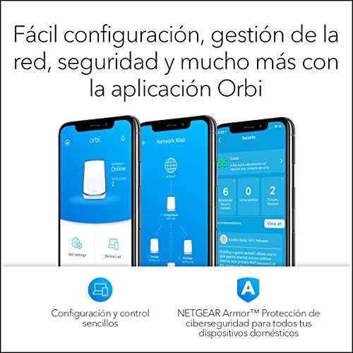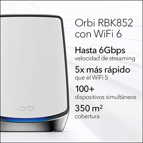 COBERTURA TOTAL: Disfruta de una potente señal WiFi de hasta 375 m² para 100 dispositivos. La tecnología WiFi Mesh te ayuda a permanecer conectado mientras te mueves por tu casa utilizando un único nombre de red; aumenta la cobertura en 175 m² extras con un satélite Orbi Mesh WiFi 6 adicional RBS850 (se vende por separado).