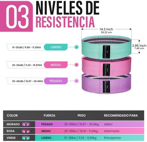 Bandas elasticas gluteos con 3 colores representan 3 niveles de ejercicios diferentes: Verde – Ligero (15-25 lbs), Rosa – Medio (25-35 lbs), Lila – Pesado (35-45 lbs).