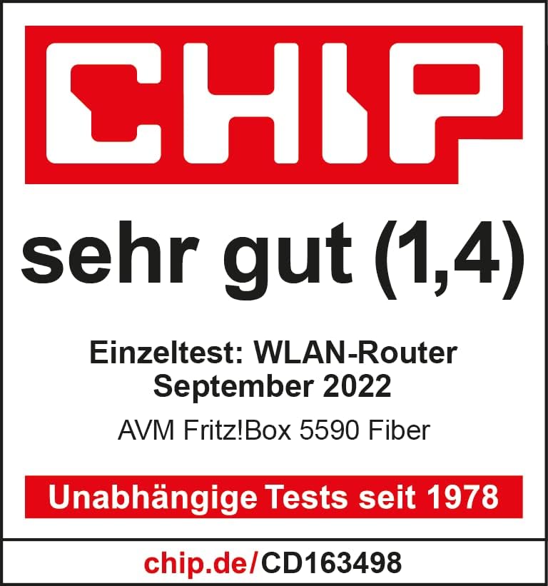 Contenido del envío: FRITZ!Box 5590 Fiber, 1x FRITZ!SFP AON, 1x FRITZ!SFP GPON, 1x fuente de alimentación, 4m cable de fibra óptica (LC/APC – LC/APC), cable LAN de 1,5 m, instrucciones de instalación