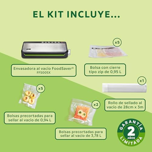 ncluye 1 dispositivo de vacío, 1 manguera de accesorios, 1 caja, 1 rollo de vacío (28 cm – 3 m), 5 bolsas pequeñas (0,94 L), 5 bolsas grandes (3,78 L), 1 manual de instrucciones | Sin BPA