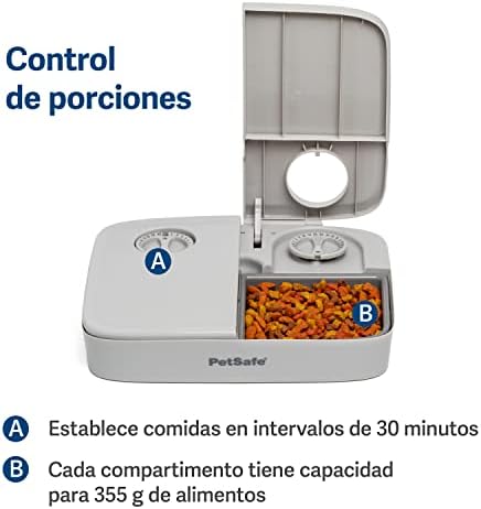 ALIMENTACIÓN REGULADA El comedero automático tiene 2 tazones, cada uno de los cuales se puede llenar con 355 ml de alimento seco, comida semiesgrima, golosinas o incluso medicamentos