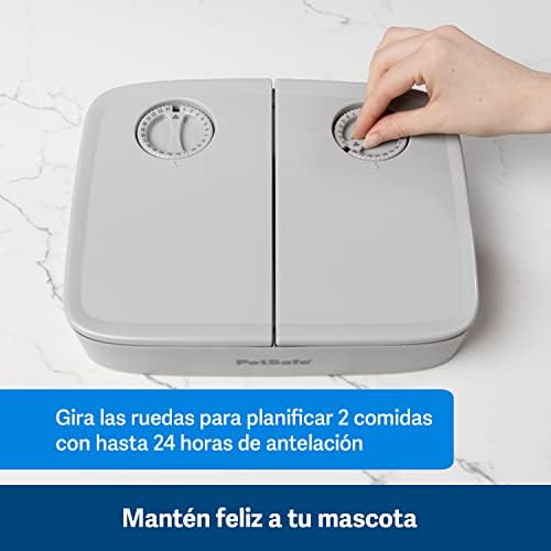 PLANIFICA LAS COMIDAS Con los temporizadores, puedes programar fácilmente 2 comidas para tu mascota a intervalos de 30 minutos, con 24 horas de antelación. Se requiere 1 pila alcalina AA (no incluida)