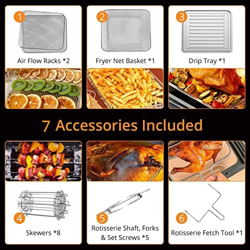 【Receta Y Accesorio Adicionales】La freidora sin aceite viene con recetas y 7 accesorios de freidora que le permiten cocinar más tipos de alimentos: tenedor para pollo, bandeja para goteo, canasta de malla, rejilla para recoger y rejillas para flujo de aire. Más conveniente para que prepares la comida que te gusta. Debido a las actualizaciones de productos, los nuevos productos han cambiado sus accesorios. Si tiene pregunta de accesorios, no dude en comunicarse con nosotros.