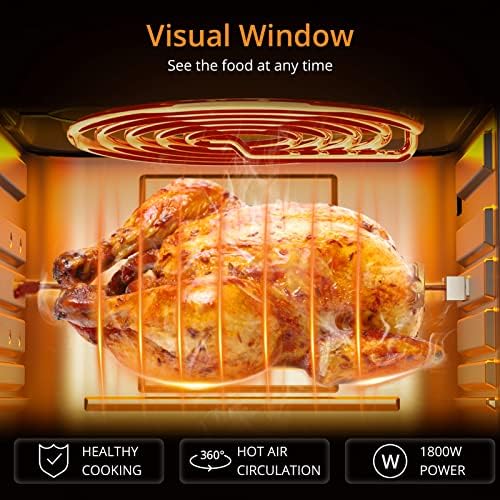 【Gran Capicidad y Ventana de vista】Acekool aire fryer tiene 1800W de gran pontencia, y el diseño de 18L con gran capacidad y diseño compacto, para que pueda preparar mucha comida gourmet para los miembros de su familia y no ocupar demasiado espacio. Ventanas de doble capa con vidrio interior y PC transparente exterior. Iluminación interior, le dan una buena vista y un toque fresco, es fácil observar la comida en el horno, de modo que la comida se puede hornear del color que desee.