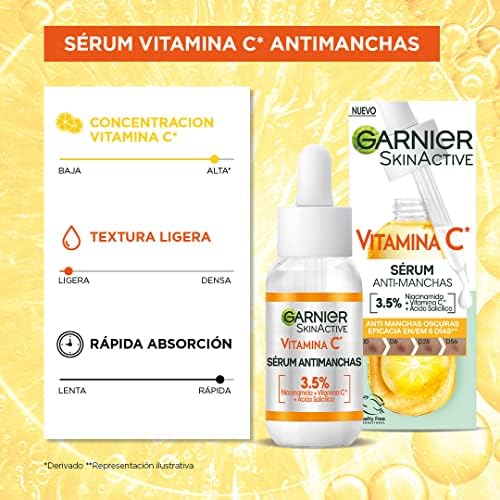 Garnier Sérum Antimanchas con 3,5% Vitamina C, Niacinamida y Ácido Salicílico. En 6 días reduce las manchas. Eficacia aprobada por laboratorios. Vegano, aprobado por Cruelty Free International