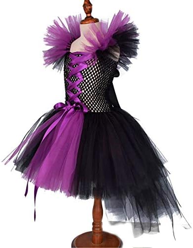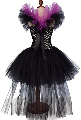 ♥ Estilo: disfraz de bruja malvada para niñas pequeñas, corpiño de ganchillo recortado de punto con detalles de cordones de cinta en la parte delantera, vestido corto o largo para su elección, vestido de tul a juego en color degradado, flores en 3D decoradas en la parte delantera, perla diseño detallado de la borla de las lentejuelas de encaje, se ve bonito y elegante. Combinados con un aro y alas con forma de cuernos, los mejores trajes de disfraces de Halloween para tu niña.