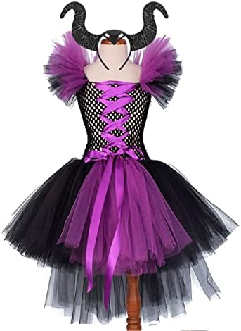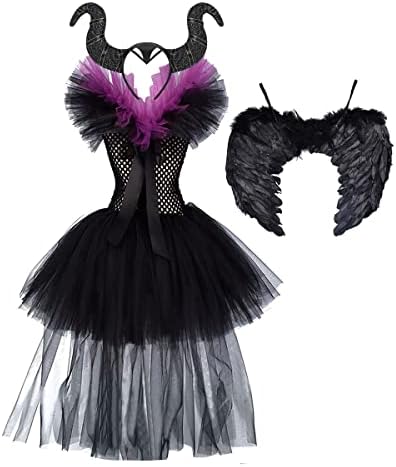 IMEKIS Disfraz de Princesa Maléfica para Niñas y Niños Disfraz de Reina Malvada Elegante Vestido de tul de Punto Hecho a Mano con Cuerno y Alas