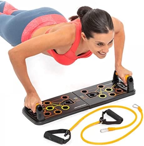 Un sistema de entrenamiento integral con tabla de ejercicios desmontable, agarraderas, bandas de resistencia y guía de ejercicios. Ideal para ejercitar todo el cuerpo.