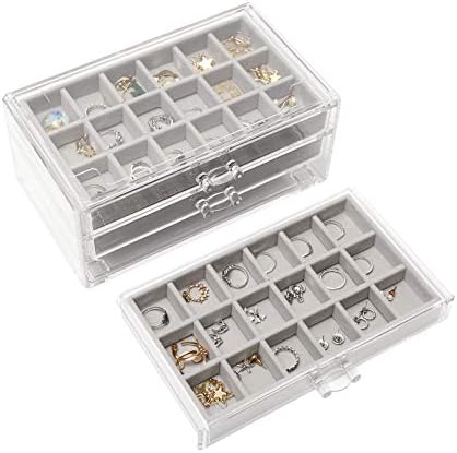 Joyero acrílico para mujer con 3 cajones ajustable organizador de joyas para anillos, pendientes, collar, apilable, bandeja de joyería, estuche de almacenamiento de cosméticos, color gris