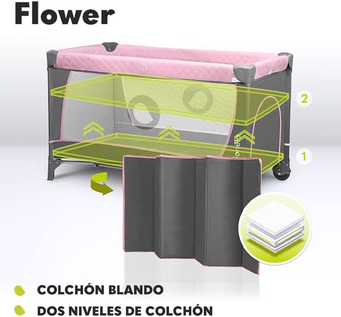 LA CUNA DE VIAJE- está equipada en una colchoneta con espuma de mayor flexibilidad. Gracias a la doble altura del colchón, Flower puede cumplir función de una cuna de viaje y de un parque. Las ruedas de transporte garantizan plena movilidad
