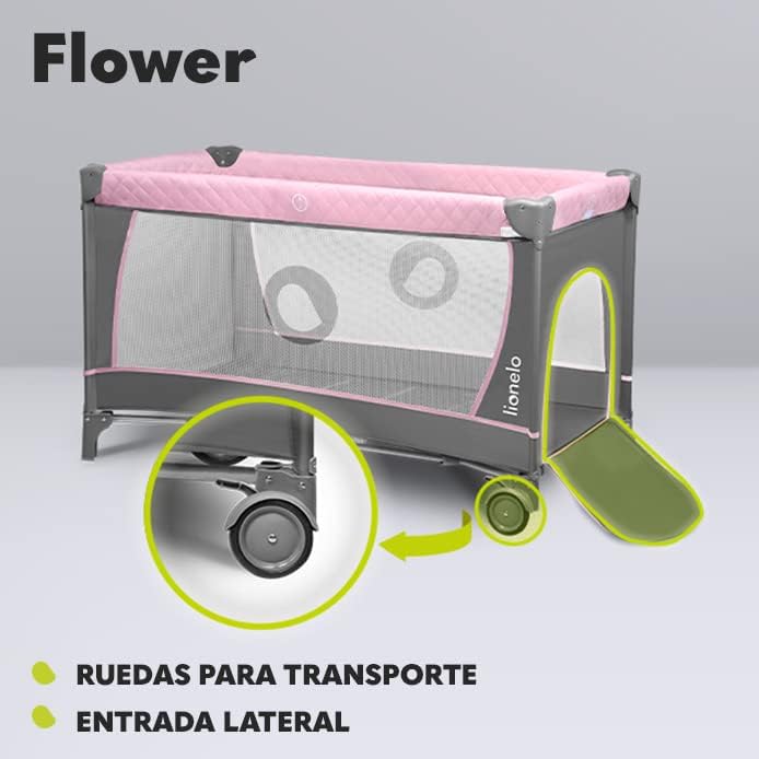 LIONELO Flower Camita de viaje 4 en 1 Para niños hasta 15 kg Colchón Organizador Cambiador Toy bar Juguetes interactivos 2 Reudas Compacta Bolsa para transportar Rosa y Gris