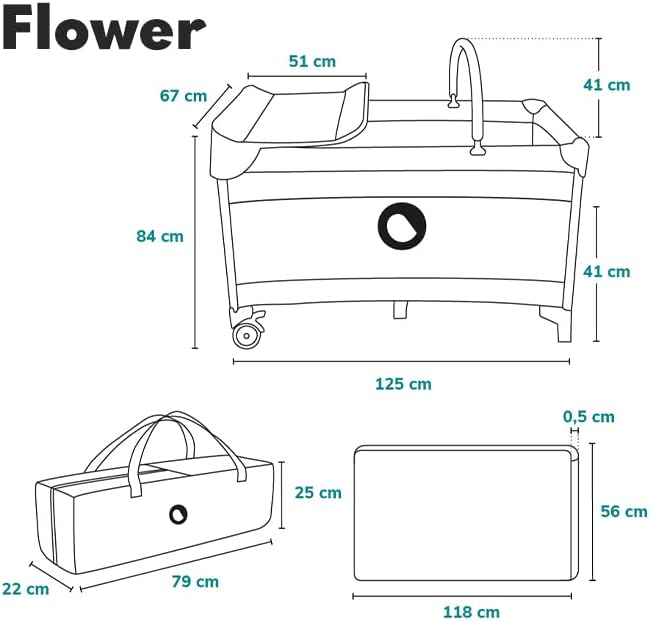 GRACIAS AL SISTEMA- de plegado hasta el tamaño compacto, Flower resulta cómodo para los viajes. Después de haber plegado el parque, la bolsa de transporte – protección facilita su transporte. La cuna, gracias a los materiales especiales, se mantiene limpia muy fácilmente