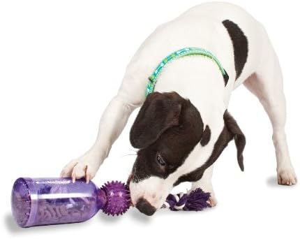 La jarra Tug-a-Jug proporciona un atractivo multisensorial para mantener a tu perro comprometido y motivado para jugar. Su diseño único permite a tu perro ver, oler y escuchar los dulces mientras ruedan en la jarra. Tu perro disfrutará del desafío mientras descubre cómo tirar de la cuerda y la envoltura de goma texturizada para agitar golosinas o croquetas desde la apertura de la botella. El Tug-a-Jug no solo dispensa golosinas, sino que se puede utilizar para entrenamiento de obediencia y alimentación de comidas. Las golosinas y los alimentos secos (no incluidos) se dispensan a medida que el juguete se vuelca, enrolla y tira Esta forma de alimentación evita la obesidad y la alimentación excesiva.