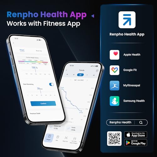 Conectividad inalámbrica con aplicaciones: La aplicación oficial Renpho Health puede descargarse de App Store y Google Play. La aplicación es compatible con Samsung Health, MyFitnessPal, Fitbit, Apple Health y Google Fit, para que puedas gestionar fácilmente tus datos de salud.