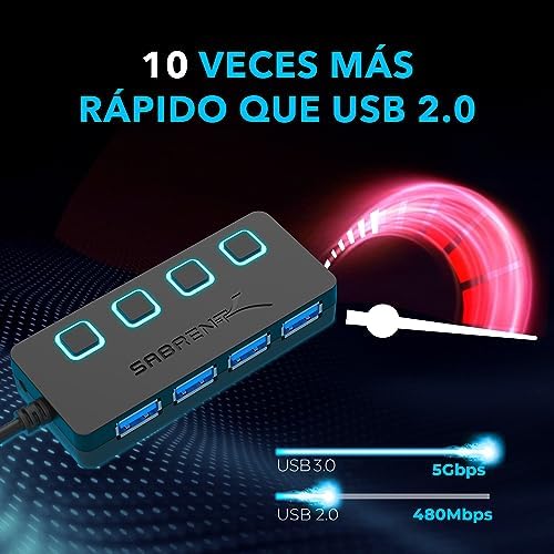 TRANSFERENCIA DE VELOCIDAD SUPERIOR: SABRENT USB HUB de 4 puertos, (transferencia de datos SuperSpeed) Con una velocidad de datos de hasta 5 Gbps 10 veces más rápida que el USB 2.0, puede transferir películas HD, música y datos en tan sólo unos segundos. (Compatible con USB 2.0 o 1.1)