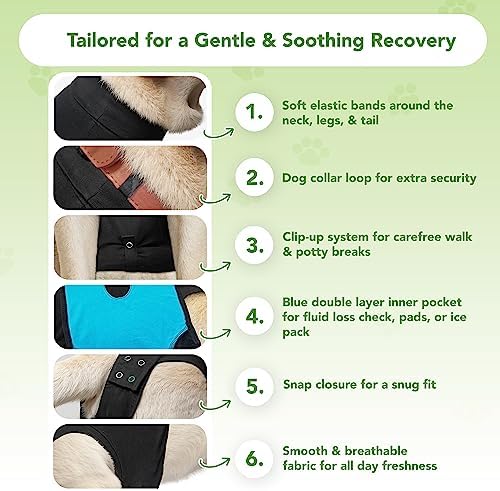 El traje de recuperación original que cubre todo el cuerpo de su perro es una alternativa profesional al uso de conos o vendajes de cuerpo completo. Ideal para las tareas de primeros auxilios, para proteger y cubrir zonas problemáticas, heridas, suturas quirúrgicas y vendajes, ungüentos, enfermedades cutáneas, cuando los animales están en celo, tienen incontinencia y mucho más…