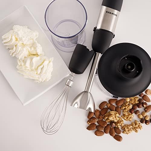 Taurus Batidora de mano con 1000W de potencia, 20 velocidades, función Turbo, diseño anti salpicaduras, cuchillas de acero inoxidable de 4 filos, accesorios picador, vaso medidor y emulsionador