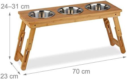 Características: soporte elevado de bambú de 31x70x23 cm; triple cuenco de acero inoxidable 700 ml